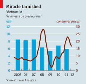 AMID the bustling trade and raucous traffic of the Vietnamese capital, innumerable banners exhort citizens to “Celebrate the Spring, Celebrate the Party.” These days, Hanoians do not have much to celebrate. Not long ago, Vietnam was one of the developing world’s pin-ups. Now it is lagging badly.The most immediate concern is inflation, which last year rose to above 20% for the second time in three years (see chart). Vietnam now has Asia’s highest inflation rate, a fact that government censors have asked local journalists to stop reporting. Thousands of businesses have gone bankrupt, property prices have collapsed and banks and state-owned enterprises (SOEs) are riddled with bad debts.